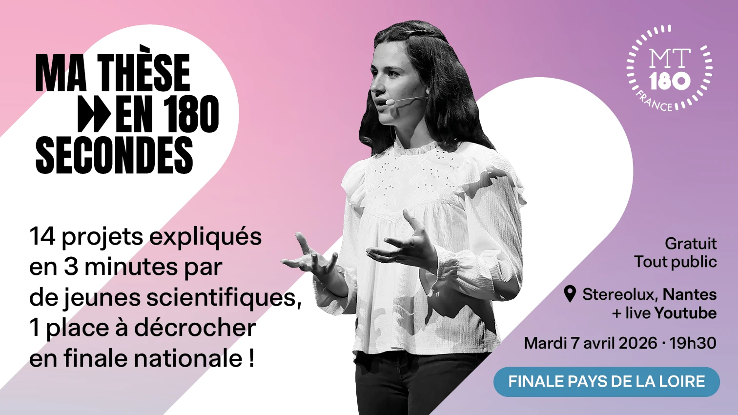 MT180 est un concours de pitch et de médiation scientifique où, à la façon d'un one man/woman show, chaque doctorant·e a 3 minutes chrono - pas une seconde de plus ! - pour faire un exposé clair, concis et surtout convaincant de son sujet de recherche, toutes disciplines confondues. Les candidat·es de la finale régionale sont issu·es des écoles et universités de Nantes, d’Angers et du Mans.